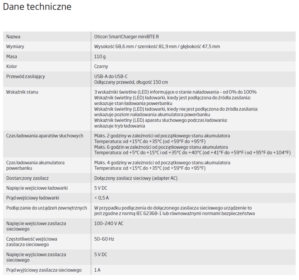• powerbank pozwalający na 3 pełne naładowania aparatów słuchowych