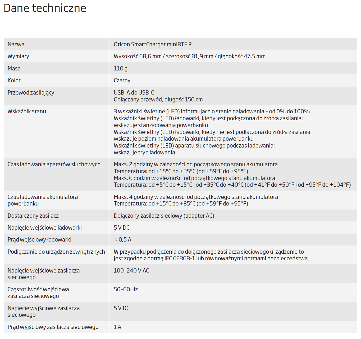 Ładowarka jest przeznaczona do ładowania aparatów słuchowych Oticon Intent miniBTE R. Wykorzystuje ładowanie stykowe. Aparaty słuchowe ładują się do pełna w ciągu 2 godzin. Ładowarka jest wyposażona w zintegrowany powerbank.