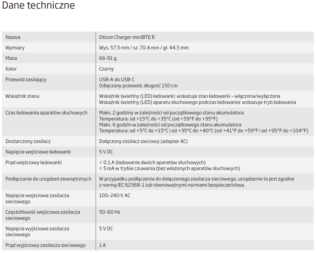 Ładowarka jest przeznaczona do ładowania aparatów słuchowych Oticon Intent™ miniBTE R. Wykorzystuje ładowanie stykowe. Aparaty słuchowe ładują się do pełna w ciągu 2 godzin.